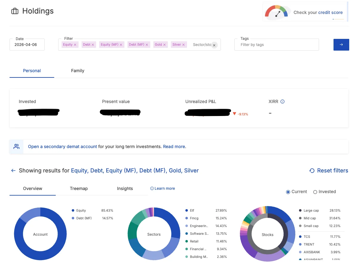 Open Zerodha's Holdings page and look at the top right of your summary card. You'll see four numbers: Invested, Present Value, Unrealized P&L, and XIRR.